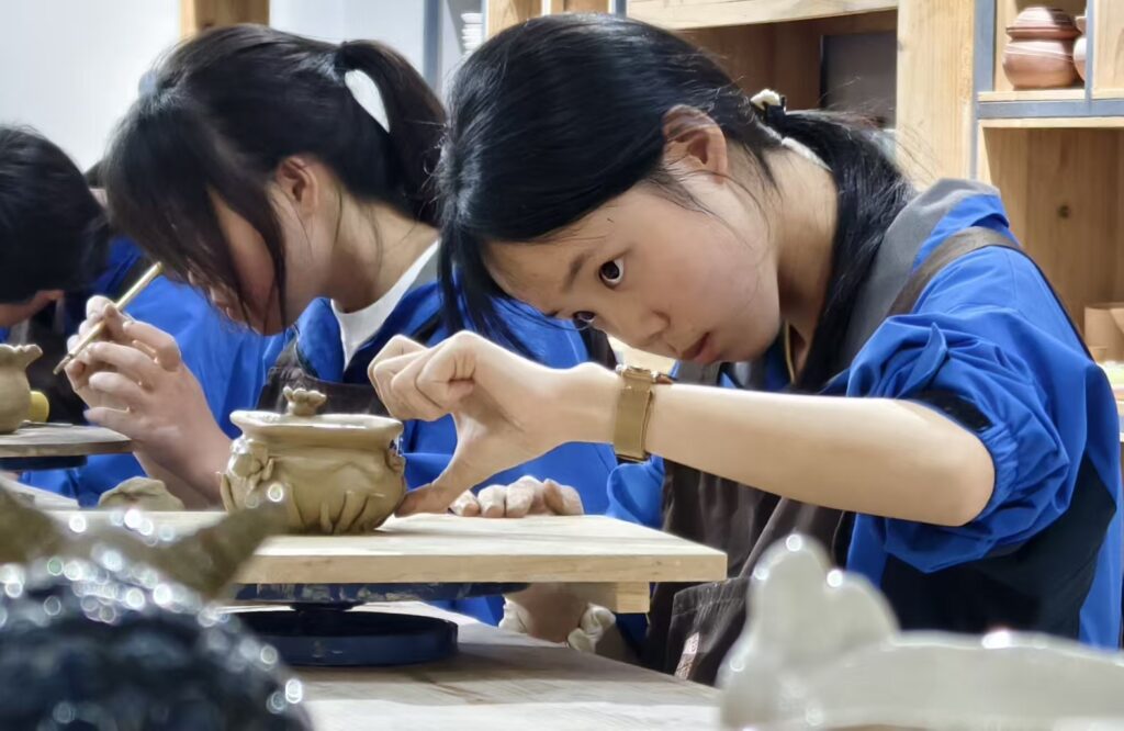 据介绍,近年来基地孵化出“馨之香”陶艺、“蝶恋花”苗绣等本土品牌,作品多次斩获市级以上赛事一等奖,部分被博物馆收藏或进入市场流通。基地非遗教学成果荣获2次省市级一等奖、3项国家级教学成果奖,培养的专业人才有力助推县域“旅游+电商”发展,推动非遗产品市场化转化,已成为全国“职教+文旅+非遗”融合发展的典型范例。